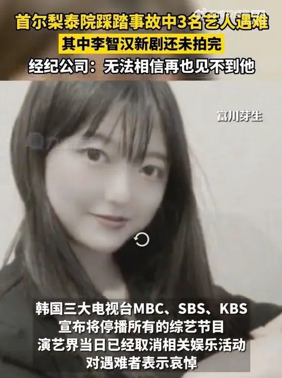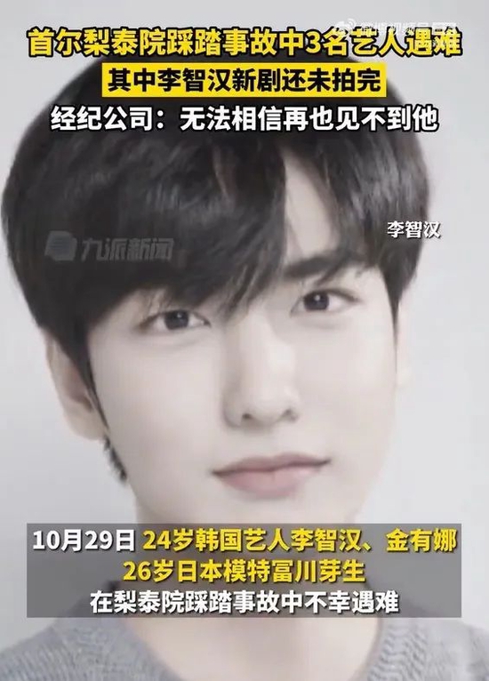 据韩媒报道,韩国青年演员李智汉确认在29日发作的梨泰院踩踏事故中遇难,终年24岁。