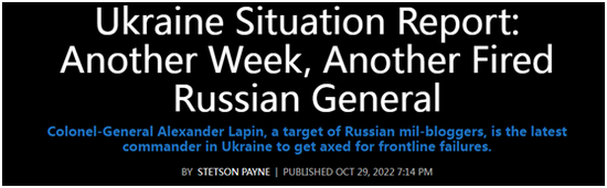 “战区”特别强调,“拉平被解职”是在苏罗维金全面指挥俄罗斯在乌克兰特别军事行动后的第三周。美媒的文章认为,高级指挥官的撤换成为俄罗斯连续八个月的军事行动的一个主题,说明俄军在军事行动中的一些战术、战略存在问题。