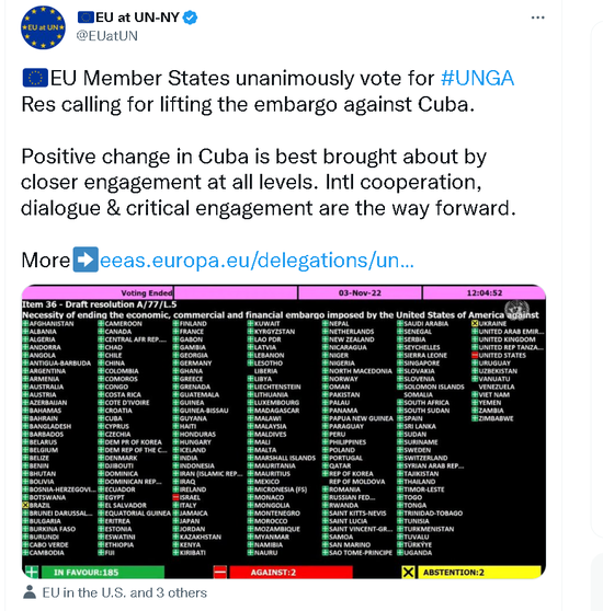 其他的187个国度中,有185个国度都投票要求美国立刻中止对古巴的经济封锁政策。