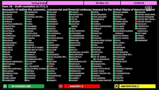 外地时间11月3日,在美国纽约团结国总部举行的第77届团结国大会上,全世界险些所有国度,通过投票的办法,再次对美国连续对主权国度古巴举行的经济封锁政策表达了强烈不满。