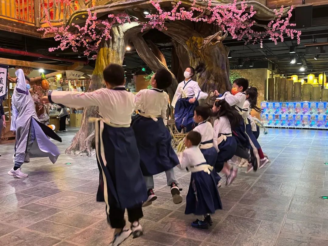 诵读声萦绕耳际,6岁的男孩阿喜好奇地偷偷睁开眼,两个按捺不住的男孩跑到树洞下的木桌旁,穿着胭粉色汉服长裙的女性NPC(非玩家脚色事情人员)见状赶快上前,提醒孩子们站好闭眼。