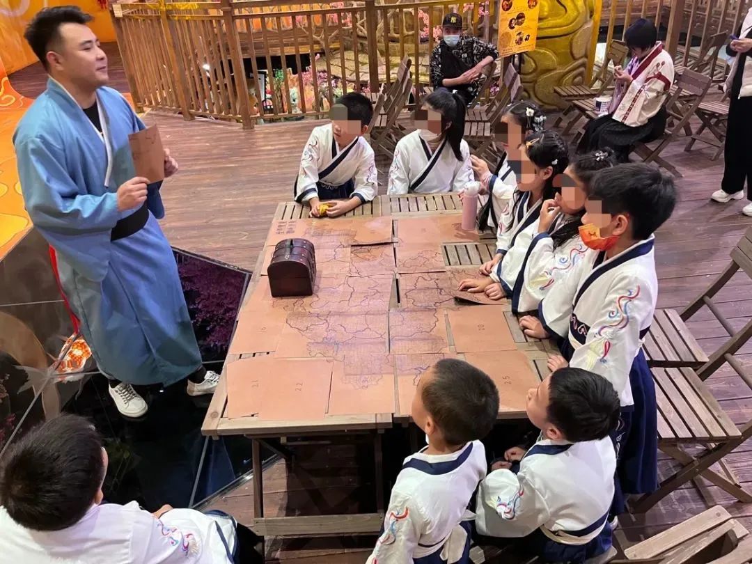 穿着蓝白色汉服长裙,戴着飘带蝴蝶发饰,八岁的女孩琪琪跑向一家国风装修作风的饮品商铺,询问老板店里是否藏有宝藏的舆图碎片。“你要先回答我一个问题,再演出一个才艺,才气给你舆图。”